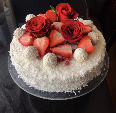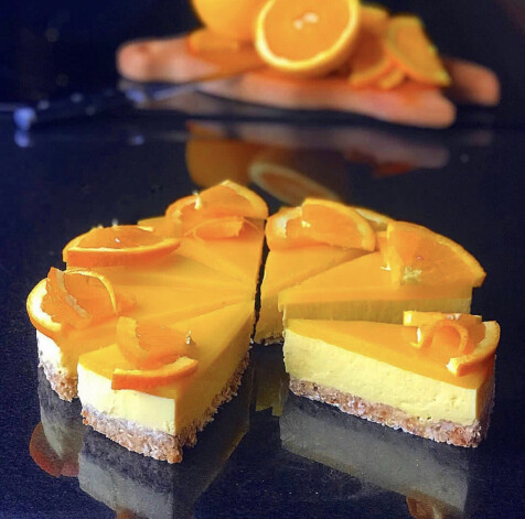 6. Kad biskvīti atdzisuši, katru aplej ar viena apelsīna sulu. Garnējumu smērē starp biskvītiem, pa virsu un gar alām. Kūku apber ar kokosriekstu skaidiņām, dekorē un liek ledusskapī atdzesēties uz 4–6 stundām vai nakti.
