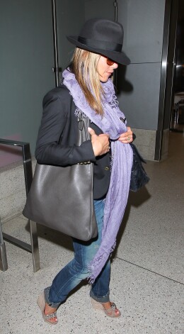 Neapšaubāmi, šalles un lakati ir ziemas praktiskākais aksesuāri, bet Anistonei tie ir visu cauru gadu. „Katras sievietes garderobē ir jābūt melnai žaketei, džinsu pārim, platformas kurpēm un vienmēr šallei!” viņa uzsver.