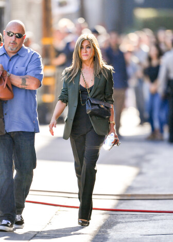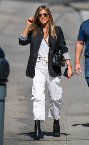 Strukturēta žakete ar džinsa biksēm ir veids, kā ikdienišķam tēlam piešķirt formālāku iespaidu. Ne velti žakete ir Anistones garderobes iecienītākais izstrādājums, kas tiek valkāts pat ar glamūrīgām kleitām.