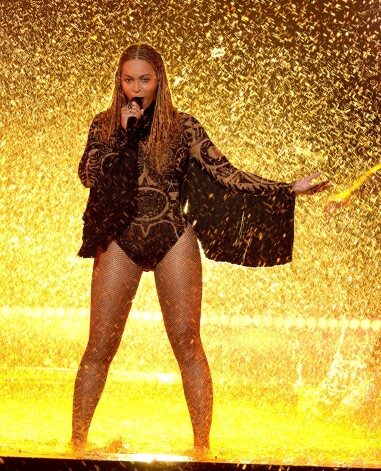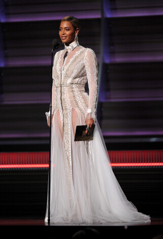 2014. gada Grammy balvu pasniegšanas ceremonijā uzstājusies ar hitu Drunk in Love, nominēta labākajam repa sadarbības projektam (ar vīru Jay Z) un visus valdzinājusi ar balto mežģīņu kleitu no zīmola Michael Costello. Tā ir darināta ar rokām un izmaksājusi 20 000 dolāru.