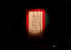 Pie frontālās sienas uzmanību piesaista, rokām izšūts uzraksts ar modes skates galveno jautājumu - "Kā būtu, ja pasaulē valdītu sievietes?". Podiuma malās rindojas arī citi tikpat smalki izšūti uzraksti, kuri skar sabiedrībai aktuālas tēmas.