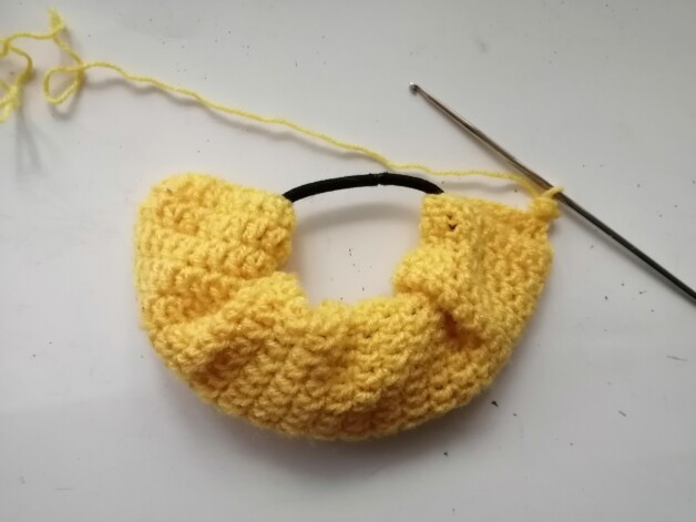 4. Aplī tamborē divkāršos stabiņus, veidojot cauruli, kas apņem matu gumiju no visām pusēm.
