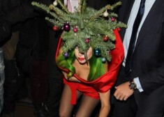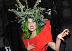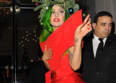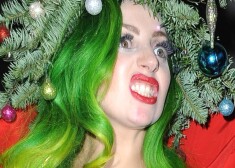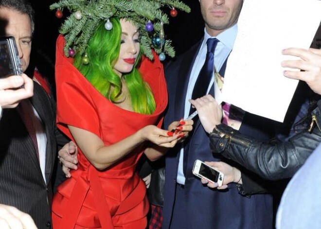 Dziedātājai Lady Gaga uz galvas īsta izpušķota eglīte