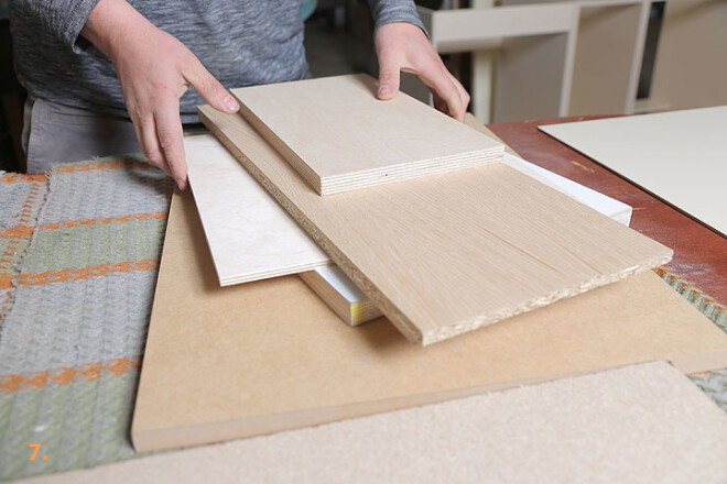 Masīvkoka plātnes (sk. 8. att.) tiek ražotas, līmējot kopā masīvkoka daļas. “Šī konkrētā ir stiķēta plātne no oša koka, līmēta pēc parketa principa. Jāsaka, ka masīvkoka plātne, lai cik arī kvalitatīva un vizuāli pievilcīga būtu, mēdz savērpties, saliekties un citādi deformēties, iespaidojoties no apkārtējās vides. Tādēļ arī galdniecībā virsmu veidošanā visbiežāk tomēr lieto pareizi izveidotas un nofinierētas skaidu plātnes – tas ir drošāk un ļauj ietaupīt,” pamāca meistars. Masīvkoka plātnes pārdod gabalos. Viens kvadrātmetrs parasti izmaksā 20–30 EUR.