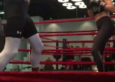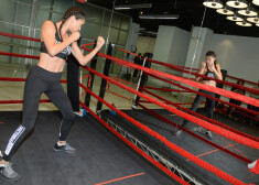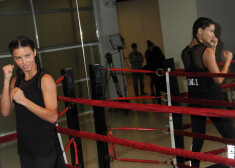 35 gadus vecā divu bērnu māmiņa sporta zālē nodemonstrēja labi trenētu vēdera muskulatūru un boksa paņēmienus, ko veica kopā ar savu ilggadējo treneri.