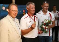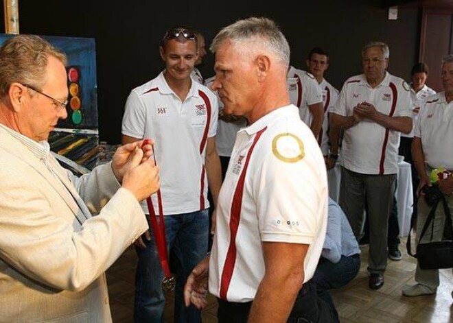 LMT prezidents Juris Binde apsveic olimpieša Mārtiņa Pļaviņa treneri Aigaru Birzuli