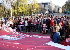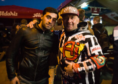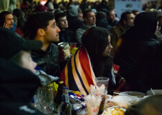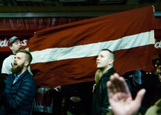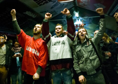 Hokeja fani Rīgā svin Latvijas uzvaru pār Slovākiju 2017. gadā