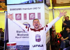 Hokejists Koba Jass fanu teltī jūt līdzi Latvijas hokeja izlasei.
