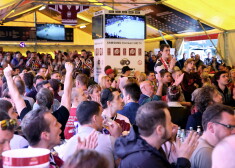 Līdzjutēji teltī pie Kongresa nama svin Latvijas hokejistu uzvaru 2017. gadā