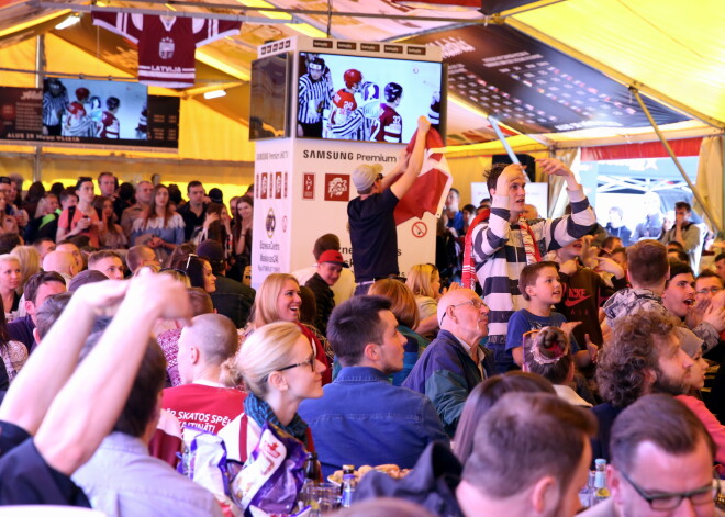 Hokeja līdzjutēji Fanu teltī pie Rīgas Kongresu nama vēro Pasaules hokeja čempionāta tiešraidi no Ķelnes, kurā tiekas Latvijas un Dānijas ...