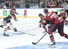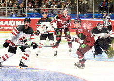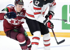 Latvijas hokeja valstsvienība cīnās pret Kanādas olimpisko izlasi