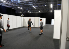 Ieskats Latvijas izlases hokejistu ģērbtuvju zonā "Jyske Bank Boxen" arēnā