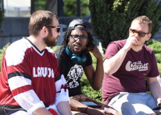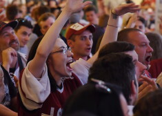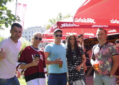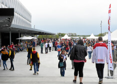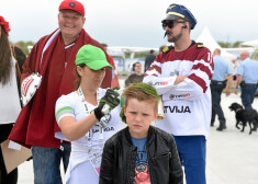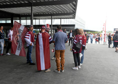 Cilvēki skatās Pasaules hokeja čempionāta spēli starp Latvijas un Vācijas valstsvienībām fanu teltī pie Rīgas Kongresu nama.
