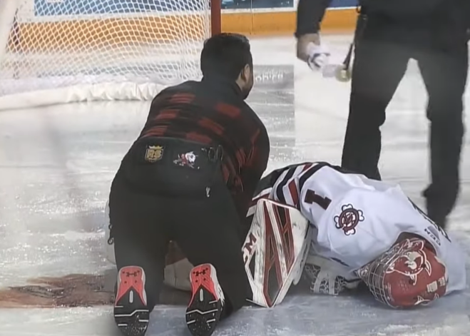 VIDEO: kanādiešu hokeja vārtsargs gūst šausminošu traumu, uz ledus atstājot milzu asins peļķi