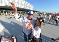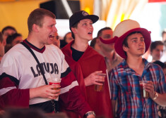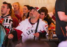 Hokeja līdzjutēji fanu teltī mačā pret ASV 2018. gadā