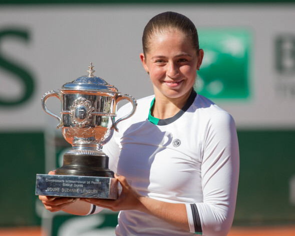 Aļona Ostapenko pozē ar "Roland Garros" uzvarētājas balvu