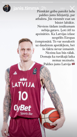 "Pirmkārt gribu pateikt lielu paldies jums, līdzjutēji, par atbalstu. Jūs vienmēr esat un būsiet labākie. Neviens šādam iznākumam nebija gatavs. Ka Latvija nespēlēs Eiropas čempionātā. Nezinu, kas būs tālāk. Paldies jums, Latvija," ar emocionālu vēstījumu pie basketbola draugiem sociālajos tīklos vēršas viens no Latvijas basketbola valstsvienības līderiem Jānis Timma.