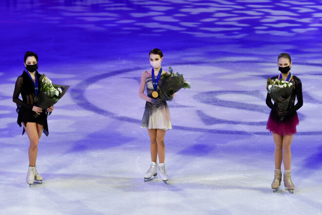 Pasaules čempionāta daiļslidošanā sieviešu sacensībās piektdien visu goda pjedestālu aizņēma Krievijas Daiļslidošanas federācijas (FFKKR) sportistes, zeltu izcīnot 16 gadus vecajai Annai Ščerbakovai.