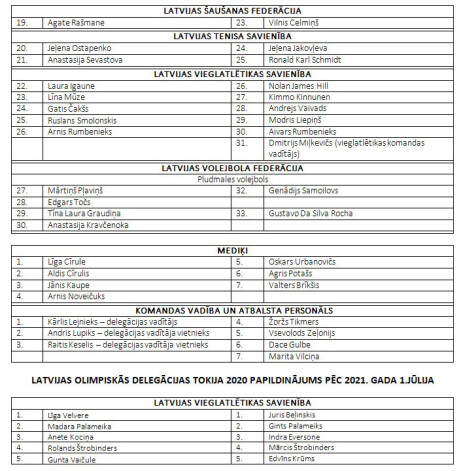 Līdz ar 30 sportistiem apstiprinātajā delegācijas sarakstā ir iekļauti arī 33 treneri, 3 sporta ārsti un 4 fizioterapeiti, savukārt komandas vadība un atbalsta personāls dodas uz Tokiju 7 cilvēku sastāvā.