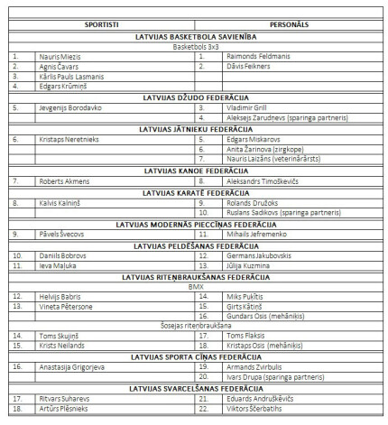 Šodien Latvijas Olimpiskās komitejas (LOK) Izpildkomitejas sēdē tika apstiprināts Latvijas Olimpiskās komandas Tokija 2020 sastāvs startam XXXII vasaras Olimpiskajās spēlēs, kas no šī gada 23.jūlija līdz 8.augustam norisināsies Japānas galvaspilsētā Tokijā. Pašlaik Latvijas komandā Tokijā apstiprināti 30 sportisti 14 sporta veidos: 3x3 basketbolā, cīņā, džudo, jātnieku sportā, karatē, modernajā pieccīņā, peldēšanā, pludmales volejbolā, riteņbraukšanā (šoseja un BMX), smaiļošanā, svarcelšanā, šaušanā, tenisā un vieglatlētikā.