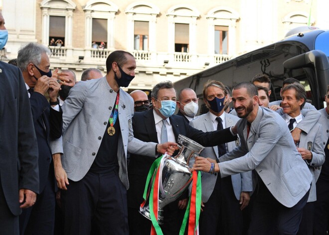 Itālijas futbola izlases spēlētāji pirmdien ar uzvaru atgriezās mājās no Eiropas čempionāta futbolā, kura finālā viņi pēcspēles sitienu sērijā uzvarēja ...