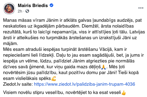 Mēs esam atraduši iespējas turpināt ārstēšanu Vācijā, kam ir nepieciešami lieli līdzekļi. Daļu to jau esam sagādājuši, bet, ja jums ir iespēja un vēlme, lūdzu, palīdziet Jānim atgriezties pie normālās dzīves savā ģimenē, kur viņu gaida mazs dēliņš," raksta Mairis Briedis klāt pievienojot "Ziedot.lv" interneta saiti: https://www.ziedot.lv/palidziba-janim-trupam-4036