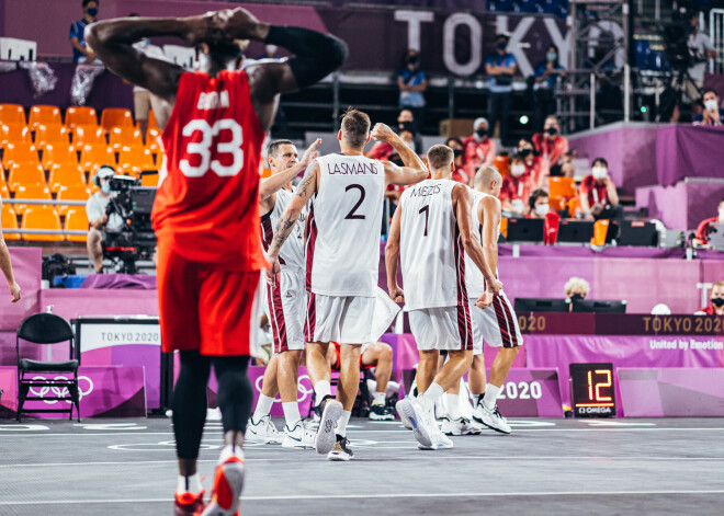 Latvijas 3x3 basketbola komanda ar Agni Čavaru, Nauri Miezi, Kārli Paulu Lasmani un Edgaru Krūmiņu sastāvā svētdien izcīnīja uzvaru Tokijas ...