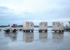 Lidostā ir speciāli būvēts stallis un iekraušanas zona, kur vienlaicīgi zirgus ieved trīs konteineros. Parasti konteinerā lido divi vai trīs zirgi, šoreiz zirgi lidoja biznesa klasē - pa divi, lai garajā ceļā katram būtu vairāk vietas.