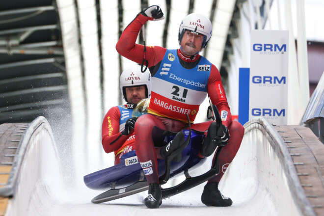 Latvijas kamaniņu braucēji Juris un Andris Šici svētdien Sočos izcīnīja uzvaru Pasaules kausa trešā posma Sprinta kausa sacensībās, kamēr Kendijai Aparjodei pietrūka četru sekundes tūkstošdaļu, lai izcīnītu bronzu.