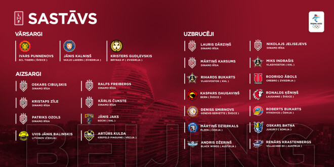 Latvijas hokeja izlases galvenais treneris Harijs Vītoliņš nosaucis valstsvienības sastāvu 2022. gada olimpiskajām spēlēm Pekinā. Latvijas izlases sastāvā iekļauti trīs vārtsargi, astoņi aizsargi un 14 uzbrucēji.