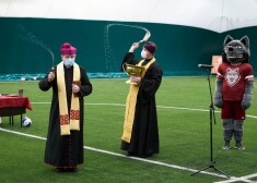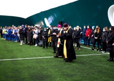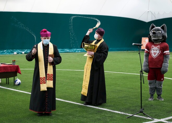 FOTO: ar baznīcas svētību Rēzeknē atklāta Latvijā pirmā piepūšamā futbola halle