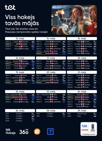 16 pasaules spēcīgākās hokeja komandas kopā aizvadīs 64 spēles – visu šo spēļu tiešraides HD kvalitātē būs pieejamas kādā no kanāliem: 360TV (17 spēļu tiešraides), 8TV (17 spēļu tiešraides ar krievu valodas komentētājiem), pop-up kanālā Tet Hokejs (33 spēļu tiešraides), kā arī Latvijas Televīzijas kanālā LTV7 (19 spēļu tiešraides). Latvijas hokeja izlases spēļu tiešraides varēs vērot LTV7, komandu tikšanos play-off spēlēs par medaļām pārraidīs 360TV, Tet Hokejs, 8TV un LTV7, savukārt cīņu par bronzu pārradīs 360TV Hokejs un čempionāta noslēdzošo spēli, kurā noskaidrosies šī gada spēcīgākā komanda, varēs redzēt gan LTV7, gan 360TV, 8TV, Tet Hokejs. Visi hokeja svētkus pārraidošie kanāli būs pieejami Tet televīzijas skatītājiem.