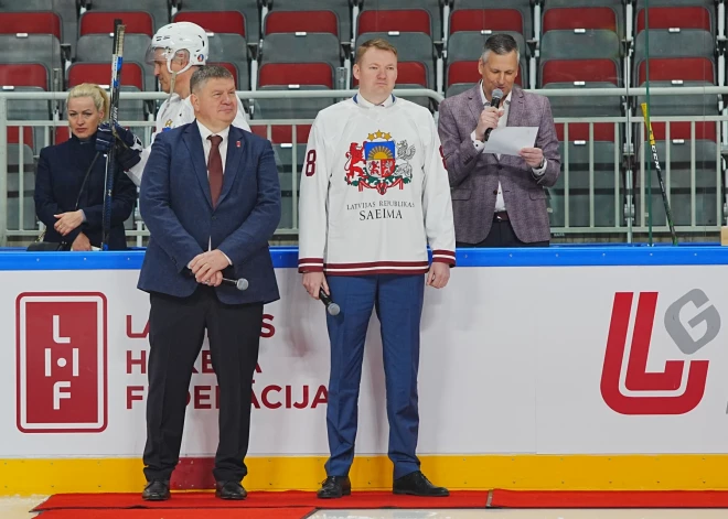 Latvijas Hokeja federācijas (LHF) un bijušo Latvijas izlases spēlētāju komanda sestdien "Arēnā Rīga" draudzības spēlē pieveica Saeimas hokeja komandu.