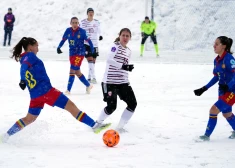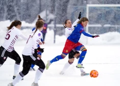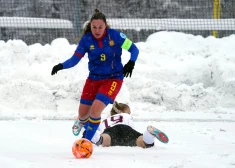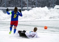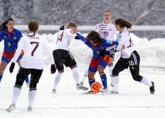 FOTO: tas ir hokejs? Nē, tas ir sieviešu futbols sniegā! Latvijas un Andoras dāmas kā trakas dzenā bumbu pa piesnigušu futbola laukumu