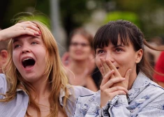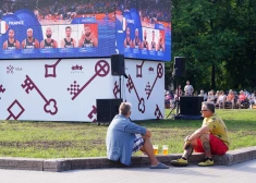 Cilvēki Esplanādē skatās Latvijas basketbola izlasi pret Franciju. 2023