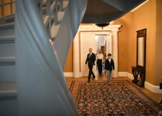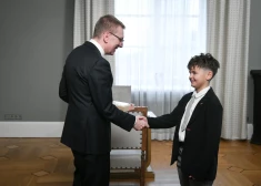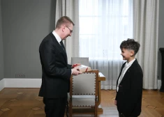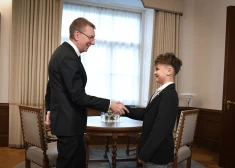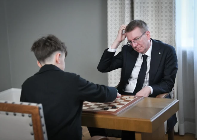 Valsts prezidents Edgars Rinkēvičs spēlē dambreti ar Latvijas čempionu dambretē (U-10) Maksimu Novicki.