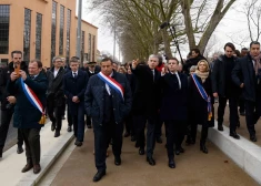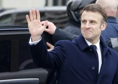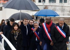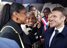 Francijas prezidents Emanuels Makrons un “Parīze 2024” rīkotāju komitejas prezidents Tonijs Estangē kopā ar olimpiskajiem čempioniem Mariju Žozē Pereku un ...