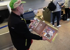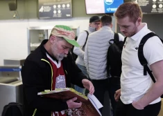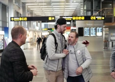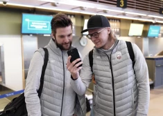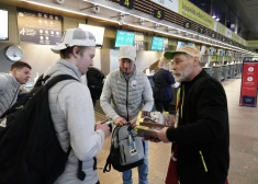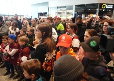 Latvijas hokeja izlases spēlētājus pēc spēles sagaida fanu pulks