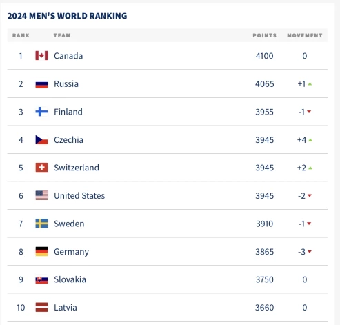 Ranga līdere joprojām ir Kanāda, kas pēc zelta 2023. gada turnīrā šogad samierinājās ar ceturto vietu. Rangā tai ir 4100 punkts. Šokējoši, ka otro vietu rangā ieņem Krievija – valsts, kas pēc pilna mēroga invāzijas sākšanas Ukrainā nav spēlējusi pasaules čempionātos jau kopš 2022. gada. Krievijas izlase rangā ir pakāpusies, jo tā visos izlaistajos gados tiek klasificēta tajā pozīcijā, kādā tā noslēdza 2021. gadu - proti, trešajā vietā (Baltkrievija - 14. pozīcijā). Tātad par pagājušā gada panākumiem mūsu hokejistiem IIHF rangā ir tikpat punktu, cik Krievijai. Vai šogad krievi saņēmuši tikpat punktu, cik Zviedrija. - Savdabīgi!