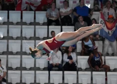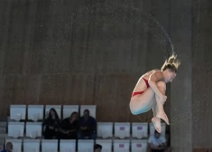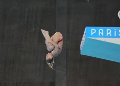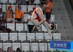 Latvijas pārstāve Džeja Delanija Patrika sacenšas Parīzes olimpisko spēļu daiļlēkšanas sacensībās no 10 metru torņa.