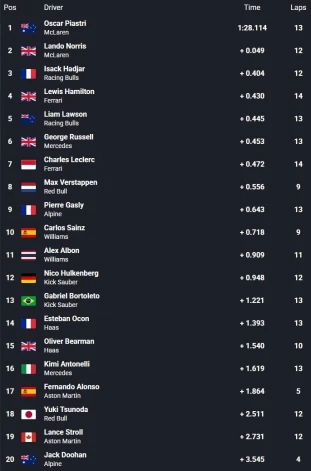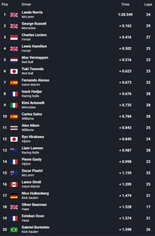 Kad noplīvoja zaļie karogi, stundu garā treniņa laika atskaitē bija palikušas vairs tikai septiņas minūtes. Daļa braucēju savus rezultātus uzlaboja, tostarp Oskars Piastri, kurš apli nobrauca ar laiku 1:28,114 un par 0,049 sekundēm pārspēja pirms tam vadībā esošo komandas biedru Lando Norisu. Līdz ar to “McLaren” piloti treniņu noslēdza pārliecinoši pirmie.