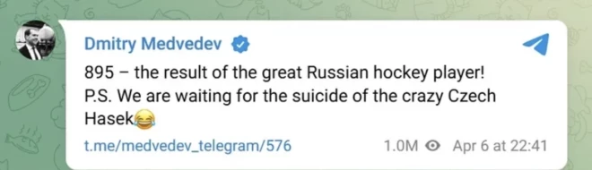 "Tuvākajās dienās Krievijas pilsonis, kurš ne reizi nav nosodījis Krievijas imperiālistisko karu Ukrainā, kļūs par NHL labāko bombardieri. Tā kā šis cilvēks nenosodīja karu un Krievijas noziegumus, viņam nāksies dzīvot ar apziņu, ka viņa publiskās uzvedības dēļ ievērojams skaits cilvēku, tostarp viņa tautieši, gājuši bojā vai guvuši ievainojumus," rakstīja Hašeks.