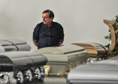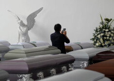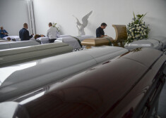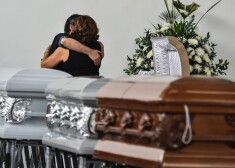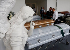 Tuvinieki Kolumbijas kapličā ar bojāgājušo futbolistu zārkiem