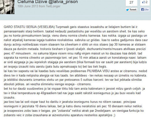 Pagājušās nedēļas beigās un šīs nedēļas sākumā mikroblogošanas vietnes „Twitter” lietotājus pārsteidza desmitiem ziņojumu no kāda Latvijas cietuma – kāds ieslodzītais profilā @latvia_prison sīki aprakstīja savu cietumnieka dzīvi un cietuma paradumus. Patlaban jau profilam ir gandrīz 7000 sekotāju, un jau vairāk 24 stundas neviens jauns ieraksts nav parādījies.