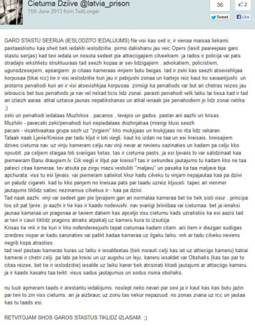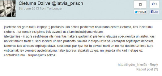 Pagājušajā nedēļā mikroblogošanas vietnē "Twitter" parādījies lietotājs "Cietuma dziive", kurš reģistrējies kā "@latvia_prison". Noprotams, ka šī persona ārpasaulei cenšas ziņot par aktualitātēm cietumā.