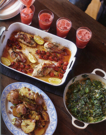 Vista. Lielā cepamajā traukā sagrieziet citronu četrās daļās un lieciet uz plāts kopā ar tomātiem. Pievienojiet apceptās vistu krūtiņas un no tām iztecējušo suliņu. Lai visu glīti izkārtotu, izmantojiet standziņas. Tad pārlieciet vistas gaļai bekona šķēles un novietojiet pannu atpakaļ uz vidējas uguns. Ieberiet rozmarīna zariņus un apmaisiet, sajaucot tos ar gaļas sulu. Tad pievienojiet rozmarīnu gaļai un cepamo veidni vismaz uz 14 minūtēm novietojiet zem grila.