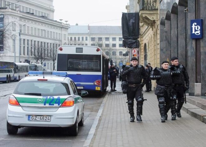Meierovica bulvārī un Raiņa bulvārī novietoti vairāki "Rīgas satiksmes" autobusi, kuros atrodas policijas specvienību darbinieki.