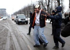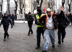 FOTO: Pie Ministru kabineta policija aiztur protestētāju pret ACTA