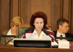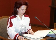 Solvita Āboltiņa Saeimas sēdi vada hokeja izlases kreklā. FOTO
