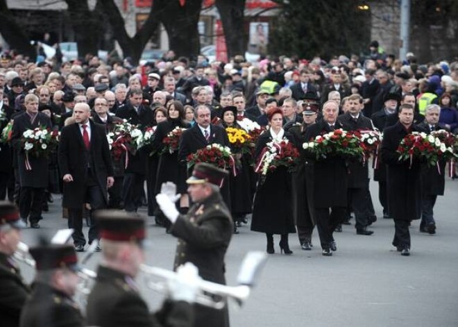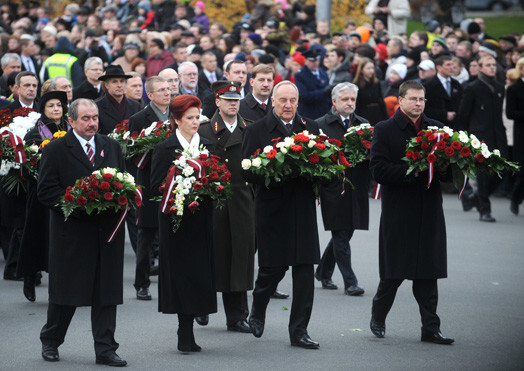 Ziedus pie Brīvības pieminekļa nolika Saeimas priekšsēdētāja Solvita Āboltiņa (V), Ministru prezidents Valdis Domobrovskis (V), Ministru kabineta locekļi, eksprezidents un tagad Saeimas deputāts Valdis Zatlers (ZRP) un bijusī Valsts prezidente Vaira Vīķe Freiberga ar kungu Imantu Freibergu, Saeimas deputāti, Augstākās tiesas priekšsēdētājs Ivars Bičkovičs, Rīgas domes pārstāvji un daudzi citi.